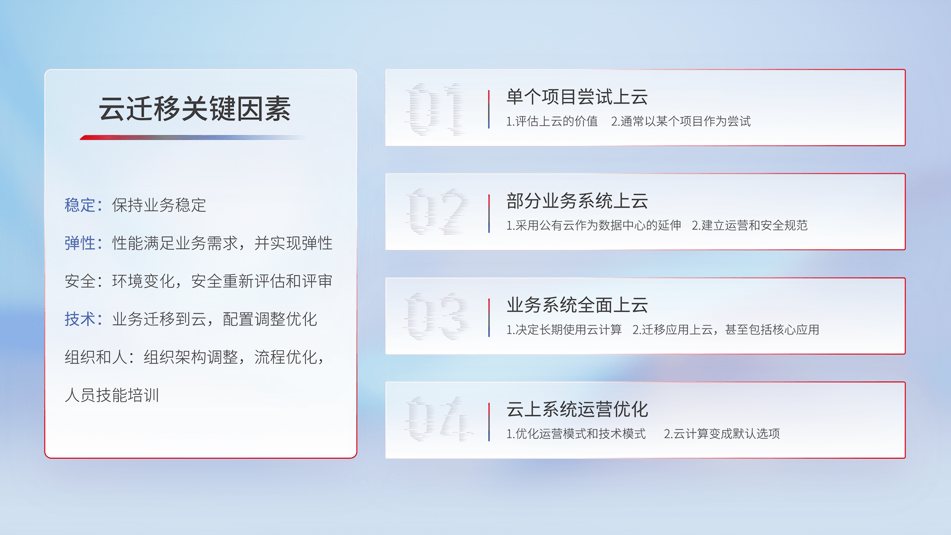 结合实际业务,,从规划设计、、、、云平台选型、、、云原生改造、、、、数据迁移、、、集成交付,,,,迁移全过程为客户识别最佳上云路径,,,做好风险识别管理,,,,设计网络架构、、、身份权限、、安全审计合规、、操作审计、、日志审计、、、、监控告警策略、、、多站点容灾设计等,,对云上基础设施进行整体规划,,,,提升IT治理水平,,,以满足弹性、、高可用、、高性能的需求。。。