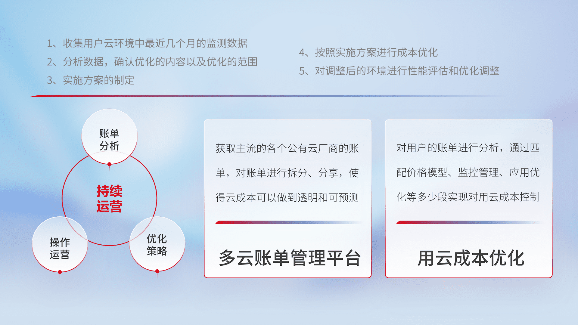 通过多云纳管,,以统一的资源数据模型把客户的云资源进行抽象和封装,,进而实现对多云资源的统一操作,,保障云资源管理的可靠性、、、、稳定性与可用性。。。。量身定制化运维内容,,,配置、、、开发运维、、、、补丁管理、、备份、、、监控、、、认证和访问管理、、、、审计和日常巡检等,,,,保障在用云过程中的可靠度,,,,稳定度以及高可用率。。。